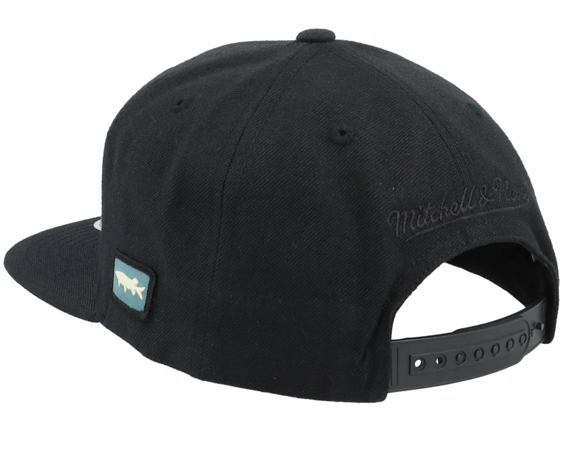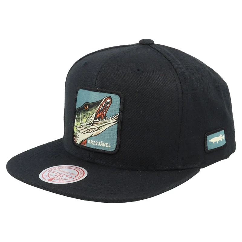 Stijlvolle, zwarte snapback-pet van Skillfish met een aantrekkelijk snoekmotief en de tekst “Grisjävel”.