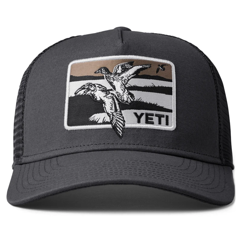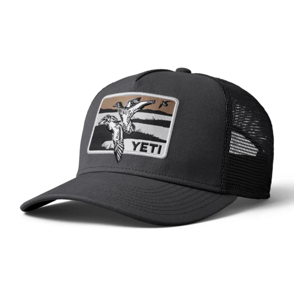 Yeti Duck Scene 5 Panel Bow Fit Trucker Dark Gray is een pet met eendenmotief en Yeti-logo. Een stijlvolle pet met een rand gemaakt van gerecyclede visnetten!